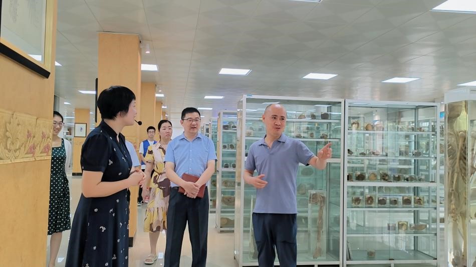 廖文莉向到场参观的各位领导介绍生命标本陈列馆的基本情况、历史沿革、馆藏特色、科教融合及师生团队等,引导领导参观了馆内组织胚胎学、解剖学、病理学及获奖标本等展区近3000个标本,对部分标本的来源、背景及历史做了详细介绍,并重点解说了镇馆之宝—出土于咸安区马桥镇的古尸。杨广聚教授等人对馆内制作精美的人体标本叹服叫绝。
