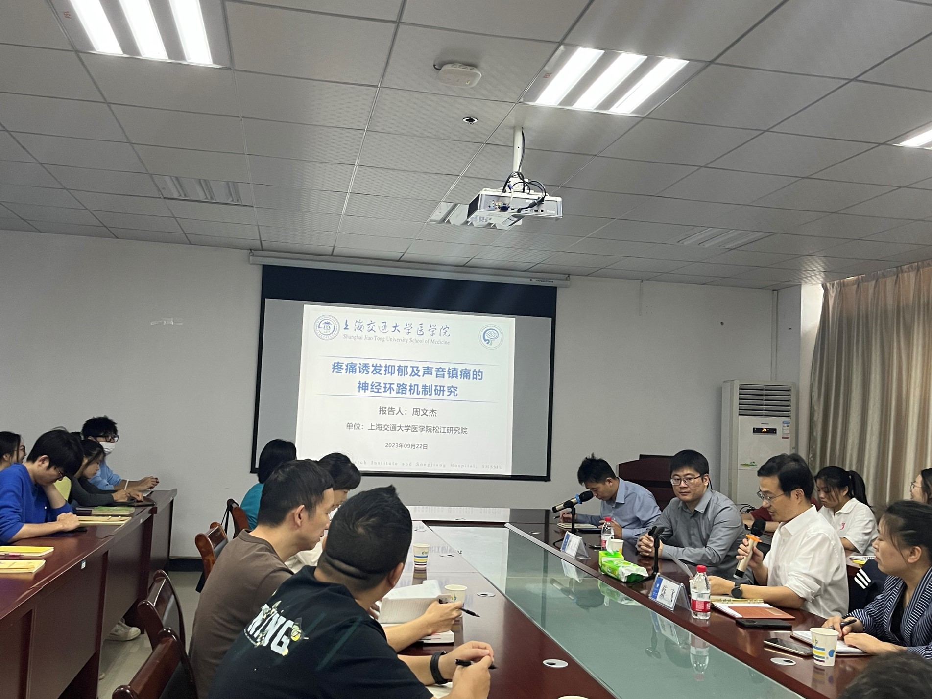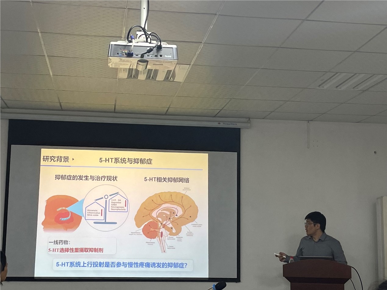 周文杰研究员首先从为什么要解析神经环路、神经环路的结构解析、神经环路变化规律解析及光遗传解析神经环路的功能等方面入手,深入浅出地分享了当前研究神经环路的理念和先进技术。他紧接着从临床研究发现音乐有助于牙科手术患者放松、减轻疼痛这一现象为切入点,深入介绍了其所探究的神经环路机制,发现低强度与环境噪音的声强差对声音镇痛至关重要,并阐明了涉及其中的大脑皮层丘脑环路机制,建立了声音镇痛模型,为该领域的研究开辟了新的方向,同时也为声音镇痛应用于临床提供有力支持。讲座结束后,周文杰研究员与师生们热情互动,并对师生们的提问进行了详细解答。报告会在师生中引发了强烈反响,大家纷纷表示对神经环路技术、疼痛诱发抑郁及声音镇痛的机制都有了深刻的了解,并对自己的研究方向有了进一步的认识。