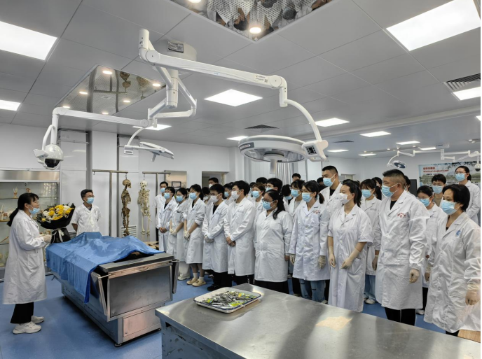 随后,全体师生怀着无比崇敬的心情,向实验室里的 “无言良师”默哀致敬,并依次敬献鲜花。一朵朵鲜花,承载着对逝者的缅怀与感恩。员工代表满含深情地说道:“他们虽无法用言语表达,但却是我们医学道路上最伟大的老师。每一次的解剖操作,都如同一场对生命奥秘的深度探索,更是一份对生命责任的庄重传承。”教研室的教师们也分享了遗体捐献者背后的感人故事,并宣读《解剖学伦理誓言》,全体员工在誓言的感召下,庄重承诺:“定当以科学严谨的态度投入学习,以人文关怀的精神践行医学使命,绝不辜负每一位‘无言良师’的生命之托。”