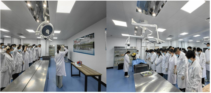 仪式结束后,师生们共同迎来了首堂实践课。授课教师熟练地通过实体标本解剖演示,细致入微地讲解重要手术入路的解剖学要点。员工们围在标本旁,全神贯注地观察教师的操作步骤,认真聆听每一个关键知识点。在随后的实践操作环节,员工们积极动手,相互交流探讨,课堂上互动氛围热烈,学习热情高涨。