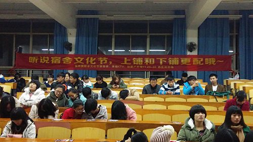 为建设良好的宿舍文化,让老员工在宿舍生活中感受到家的温暖,同时锻炼新生的团结协作精神。2014年12月4日~5日晚,由BETWAY必威主办的第四届宿舍文化节——“听说宿舍文化节,上铺下铺更配哦”初赛场在教5-201举行。