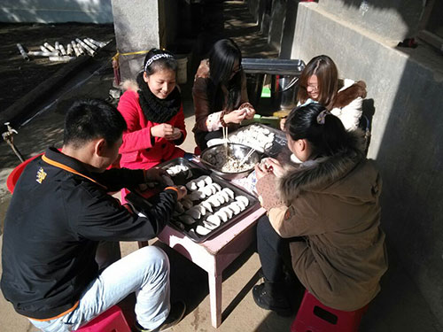 刚一下车,小朋友们便蜂拥而至,在小朋友们的簇拥下,前往的志愿者分成几拨,一拨到教室去布置,一拨到厨房包饺子和馅,还有一拨陪着孩子们在操场上玩耍。一切都井井有条地进行着,小朋友们东看看、西瞅瞅,也忙得不亦乐乎。