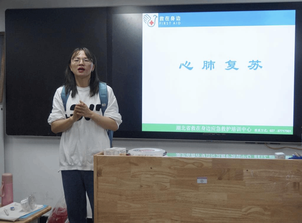 活动当晚20:40点,志愿者携带急救演练道具进入班级,活动场地布置完毕后,伴随着同学们期待的目光,志愿者们正式开始讲解。首先,由吴宁华老师向同学们讲解关于人类在短时间缺氧时的症状、缺氧对机体造成的损伤,并重点介绍了心肺复苏的操作方法。吴老师一边讲解专业知识,一边亲自演示,向同学们介绍如何确认患者的生命体征,如何正确使用“切额抬颏法”定位患者的头部位置等知识。吴老师层层深入、生动形象的讲解,让同学们深刻地领悟到心肺复苏在急救方面的重要性。