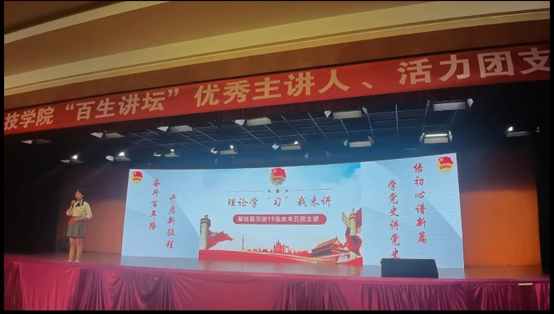 活力团支部比赛设置有两个环节:一是支部学“习”成果介绍;二是支部风采展示。在支部学“习”环节,主讲人李菁琦从支部概况与简介、支部建设与管理、支部风采与成果、支部学“习”与展望四个方面进行了汇报。汇报中提到:19临床本五班即19卓越医师班,特设课程有pbl、大体解剖实验等。支部组织健全,按照共青团三会两制一课要求,学习情况良好。支部成员勤于学习、勇于探索,积极参加医院见习、志愿防疫、科研项目等多种活动,在理论学习之余注重全面发展。支部风采展示部分采用情景剧的形式,以时间为轴,联系2003年与2020年的两次疫情,同学们深受触动,真情实景地演绎出疫情防控期间支部成员参与的各项志愿服务工作,彰显了支部成员作为医员工的责任与担当。在节目的尾声,全体成员集体演唱歌曲《少年·建党版》,深情献礼建党一百周年。