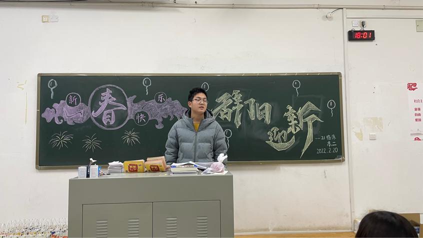 通讯员 林小驰)时钟滴答分分秒秒,光阴飞纵岁岁年年。为了丰富班级文化生活,增强班级凝聚力,展示师生风采,2022年2月20日晚医学部21临床医学2班在教学楼7栋204开展“辞旧迎新,新年新气象”主题班会。