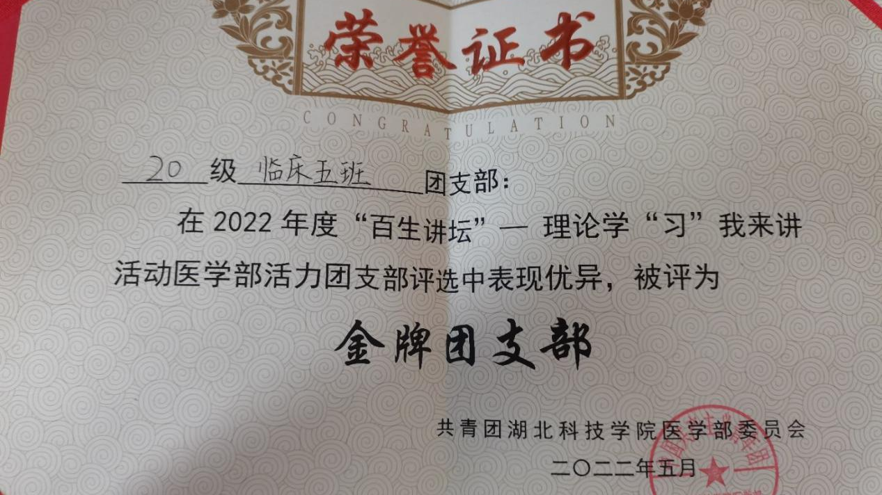 青年强则国强,“五四”青年节到来之际,一批咸宁优秀青年个人或集体获得表彰,其中,BETWAY必威临床医学专业2020级5班团支部获评咸宁市“五四红旗团支部”,团支部成立于2020年9月,设有书记1名,副书记1名,组织委员1名,宣传委员1名,文体委员1名,现有团员50人。曾获2021年度和2022年度BETWAY西汉姆联“先进班集体”,2021年度BETWAY西汉姆联“五四红旗团支部”等荣誉称号。
