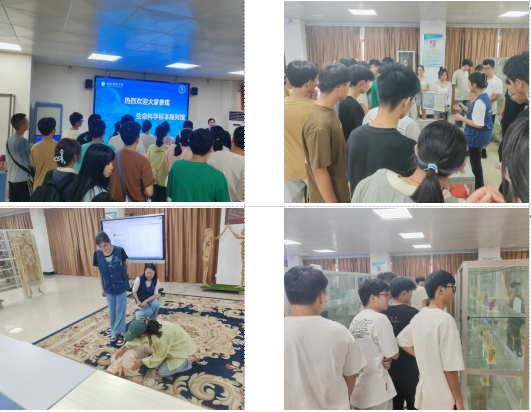 看,这群新同学们,他们都紧紧跟随志愿者的脚步,正在有序地进行参观。志愿者们首先向新同学们深入介绍了标本的历史背景及其科学价值,使同学们对这一省级科普教育基地有了更深刻的理解。接着,讲解员与示范员协同合作,向同学们展示了CPR心肺复苏的急救知识,并通过实际操作演示确保每位同学都能熟练掌握这一关键的急救技能。