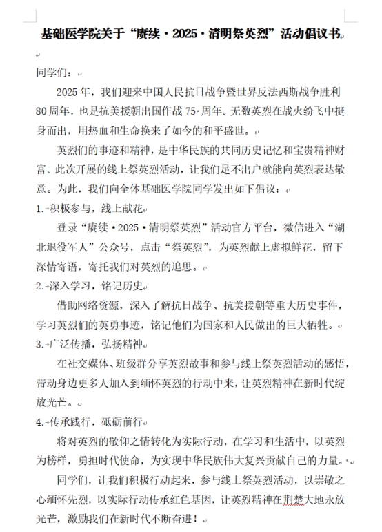 (通讯员:李杨慧 黄乔木,审核:佘同辉 程梦琳)2025年4月5日,正值中国人民抗日战争暨世界反法西斯战争胜利80周年和抗美援朝出国作战75周年之际,BETWAY必威发布“赓续·2025·清明祭英烈”活动倡议书,开展线上祭扫活动。此次活动旨在缅怀革命先烈,弘扬英烈精神,激励新时代青年勇担时代使命。