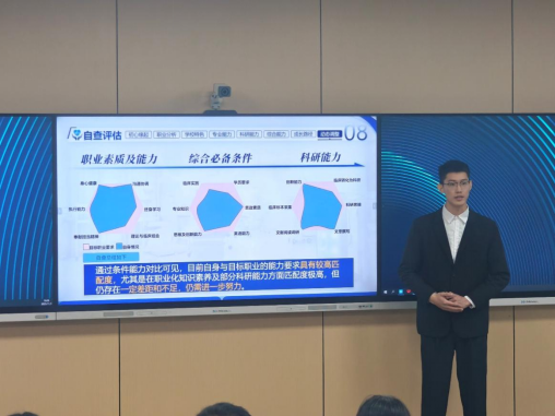 汇报结束后,任展宏进行专业点评。他充分肯定了全体选手在职业规划中的深入思考与扎实付出,认为大家的汇报既贴合医学专业特色,又展现了青年一代的责任担当。同时,他针对汇报细节提出宝贵建议,包括优化语言表达逻辑、提升PPT视觉展示效果、规范数据来源标注等,为选手们进一步完善职业规划、提升汇报能力提供了有力指导。经过评委评定,段若和张雅婷同学荣获就业赛道一等奖,陈薏冰和张璐妍同学荣获就业赛道二等奖,关业勤和黄文锦同学荣获就业赛道三等奖,唐永松和鲁炎冰同学荣获成长赛道一等奖,胡英、洪思博、陈思娇和李杨慧同学荣获成长赛道二等奖,黄才群、秦璇、柳金霞、路丹、李纪桐和蒋雨彤同学荣获成长赛道三等奖。