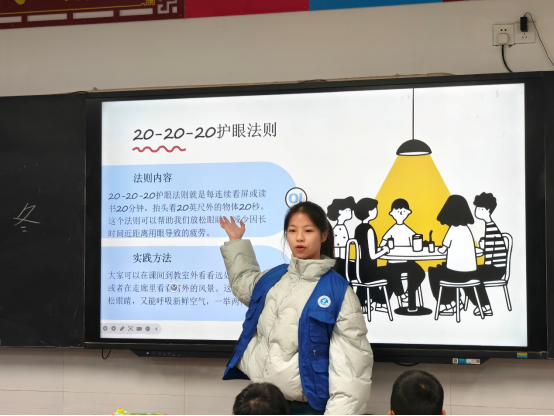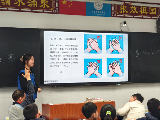 活动中,两位志愿者的科普分享干货满满。“我们的眼睛就像一台精密的‘小相机’,想要一直拍下清晰美景,就得好好呵护它。”梁晨茜同学以“小员工护眼大作战”为主题,用形象比喻解析视力问题成因,传授“三个一”读写标准与“20-20-20”护眼法则,现场带领孩子们练习眼保健操并推荐护眼食材。查静怡同学则以“冬日健康小卫士”为题,从六大感冒诱因切入,讲解“三层衣”保暖法、均衡饮食等预防措施,还手把手教孩子们掌握“内、外、夹、弓、大、立、腕”七步洗手法,帮助大家筑牢健康防护墙。
