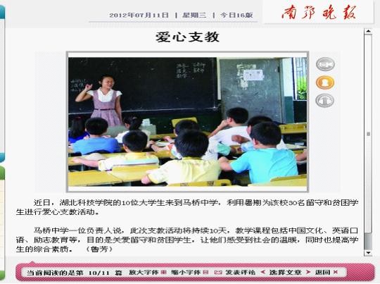 BETWAY必威自09年来,携手马桥中学举办的众多活动让一些来自贫困家庭的孩子感受到了社会的关爱。时至今日,同学们依然坚守着这样一份责任,为马桥中学的孩子们带去一点又一点的希望之光。这次支教活动也引起了咸宁媒体的广泛关注。南鄂晚报、咸宁日报、咸宁电视台等媒体都对此次活动做了相关报道。同学们不仅感受到了自己付出的微薄力量,还看到了整个社会对希望的坚守,对爱心的关注。
