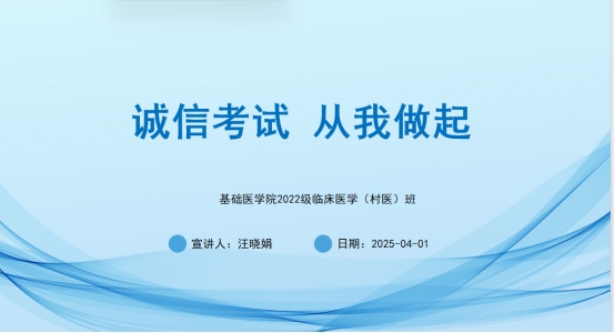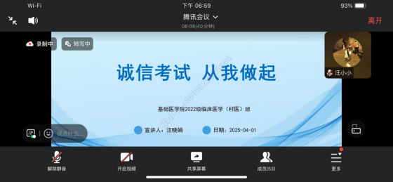 (通讯员:汪晓娟 谭志,审核:佘同辉 程梦琳)4月1日晚,BETWAY必威2022级村医班通过腾讯会议平台召开线上主题班会,围绕即将到来的专升本考试诚信应考与实习安全展开专题教育。会议由班主任汪晓娟老师主持,全体在外实习员工参加。