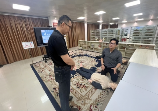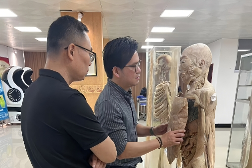参观过程中,陈列馆工作人员、人体解剖学教师吴攀峰向王广峰详细介绍了陈列馆的历史沿革、核心职能,并带领其逐一了解各展区珍贵标本,特别是现场进行了心肺复苏(CPR)手法的规范演示,展现了陈列馆在普及急救技能方面的生动实践。