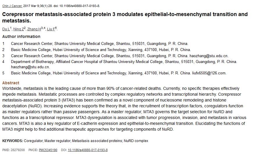 该论文主要研究转移相关蛋白家族(MTAs,metastasis-associated proteins)在激素非依赖性肿瘤中的作用和转移相关蛋白3(MTA3,metastasis-associated protein 3)调控癌细胞上皮间质转换(EMT,epithelial-to-mesenchymal transition)进而调节癌细胞转移过程中的作用。该论文是宁博士延续2014年在SCI期刊《Cancer Metastasis Review》(该杂志当年影响因子为7.234)发表论文的研究。
