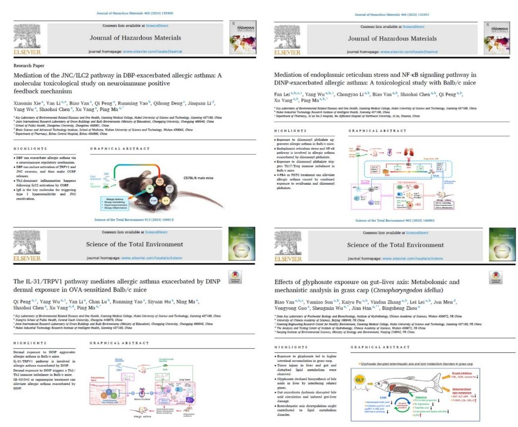 其中,3篇SCI论文以马萍教授为通讯作者,在读研究生和武阳教授等为共同第一作者,分别发表在中科院一区TOP期刊《Journal of Hazardous Materials》(IF=13.6)、《Science of the Total Environment》(IF=9.8)上,研究成果以过敏性哮喘为主题,揭示了增塑剂邻苯二甲酸二丁酯(DBP)、邻苯二甲酸二异壬酯(DINP)与过敏性哮喘之间的关联机制。1篇SCI论文发表在中科院一区TOP期刊《Science of the Total Environment》(IF=9.8),晏彪副教授为论文第一作者。该研究成果揭示了水生环境中鱼类接触除草剂草甘膦的代谢健康风险。