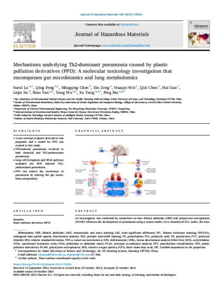 (通讯员马萍审稿蔡飞)近日,中科院一区Top期刊《Journal of Hazardous Materials》(IF=13.7)在线发表了题为《Mechanisms underlying Th2-dominant pneumonia caused by plastic pollution derivatives (PPD): A molecular toxicology investigation that encompasses gut microbiomics and lung metabolomics》的文章。该研究由公司BETWAY必威环境疾病与全健康校级重点实验室马萍教授团队主导完成,BETWAY西汉姆联为第一署名单位,鲁素蕊博士为第一作者,马萍教授为通讯作者。