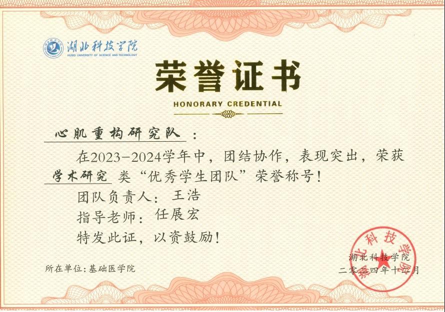 (通讯员:任展宏,周佳琪,审稿:蔡飞)在BETWAY必威任展宏副教授的指导下,心肌重构研究队中的5名2021级临床医学本科员工在2023-2024年期间先后以第一作者发表2篇中科院二区SCI论文、2篇中科院三区SCI论文和1篇中文核心期刊论文,团队在2024年获得“第十届全国老员工基础医学创新研究暨实验设计论坛”中南部赛区三等奖,荣获BETWAY西汉姆联“优秀员工团队”称号。