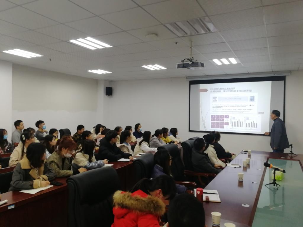 杨旭教授结合本人多年以来的丰富科研经历和感悟,报告深入浅出,以心血管疾病、肿瘤等当前我国疾病负担最为严重的五大类疾病为关注对象,从五大类疾病与氧化应激的关系、氧化应激相关疾病的特征、代谢综合征的特点做了介绍,进而提出了中国大卫生的“三箭齐发”必由之路:控制能量平衡、治疗和预防代谢综合征、治疗和预防氧化应激症,并就探索天然抗氧化剂应用的重大意义前景做了详细深入的阐述。在报告后的学术交流过程中,杨旭教授耐心解答老师和同学们的疑惑,就科研方向的选择、“氧化应激”和“氧化炎症”的健康标准等大家关注的问题进行了热烈讨论,在场的师生们都受益匪浅。