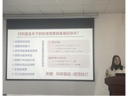 讲座中,邢君博士以《撰写国家自然科学基金的一点体会交流》为题,介绍了高质量的国基金标书所需具备的条件,并着重讲解了国基金各部分的撰写要点和思路。报告结束后,申报人员就基金申报过程中遇到的问题进行深入交流,邢君博士还热情地分享了她在往年申报国基金方面的经验,以帮助大家申报书的修改。她建议申请人在修改时可以寻求校内外专家的意见和建议,以便更全面地审视自己的研究计划和申请书。