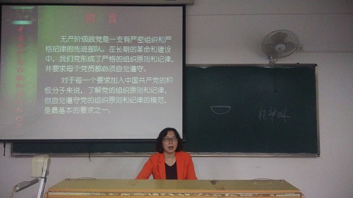 2017年5月8日晚上,BETWAY必威分党校入党积极分子在解剖楼教室参加“中国共产党的组织原则与纪律”培训课,此次培训邀请到BETWAY必威党总支书记程梦琳老师 。学员们通过学习党的组织原则与纪律,了解到党的组织原则与纪律, 能够“以身作则,严于律己,讲诚信、懂规矩、守纪律,襟怀坦白、言行一致,心存敬畏、手握戒尺”,使学员们从思想上对党的认知改变,从而对党忠诚老实,对群众忠诚老实,有利于发扬党的组织与纪律性,继承党的先进性与光荣性,为实现伟大的中国梦奋斗,争取做合格的建设者和可靠的接班人。