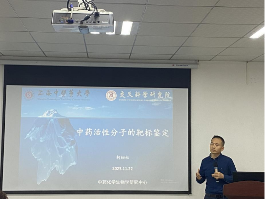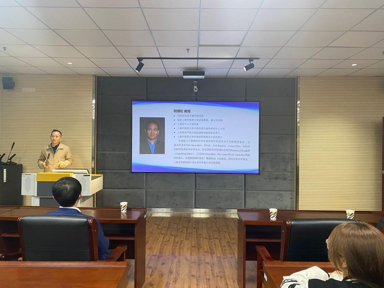柯细松教授分享了其团队的研究工作,柯教授的讲座以结肠癌治疗为例,详细讲述了中药有效成分功能靶标蛋白的鉴定方法,并介绍了他的“中药靶标1000”计划。讲座结束后,柯教授热情地与师生们展开互动,并对提出的问题给予了详尽的解答。